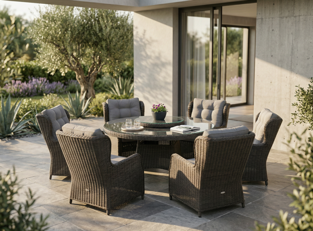 Šis valgomojo komplektas yra puikus pasirinkimas tiek mažoms, tiek didelėms terasoms. Jo universalumas leidžia pritaikyti baldus pagal jūsų poreikius ir sukurti jaukią, patogią ir stilingą lauko erdvę.
