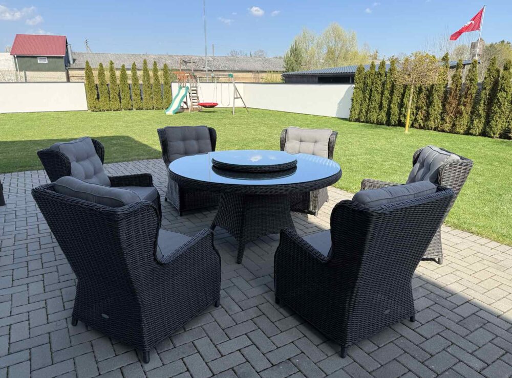 Šis valgomojo komplektas yra puikus pasirinkimas tiek mažoms, tiek didelėms terasoms. Jo universalumas leidžia pritaikyti baldus pagal jūsų poreikius ir sukurti jaukią, patogią ir stilingą lauko erdvę.