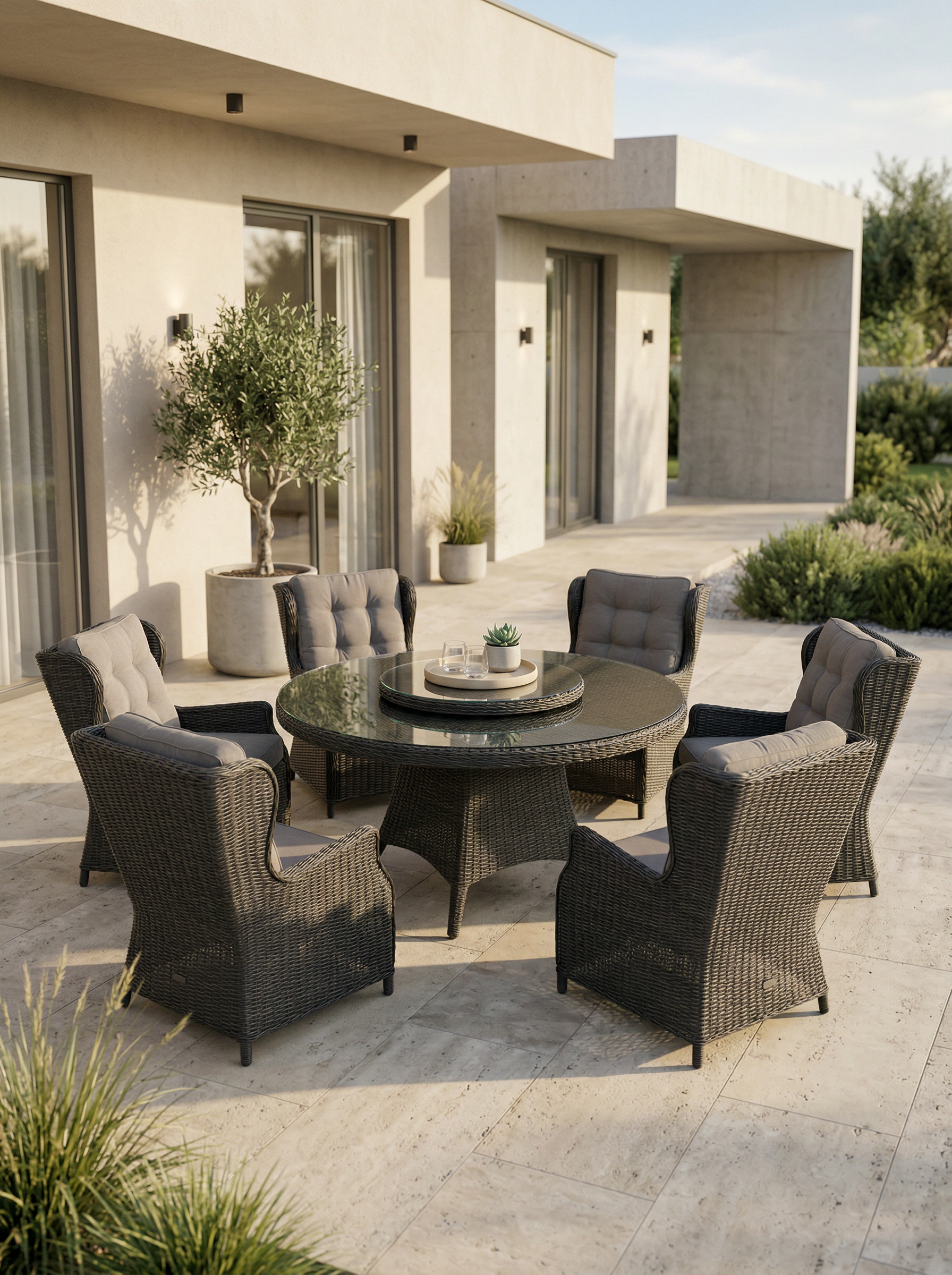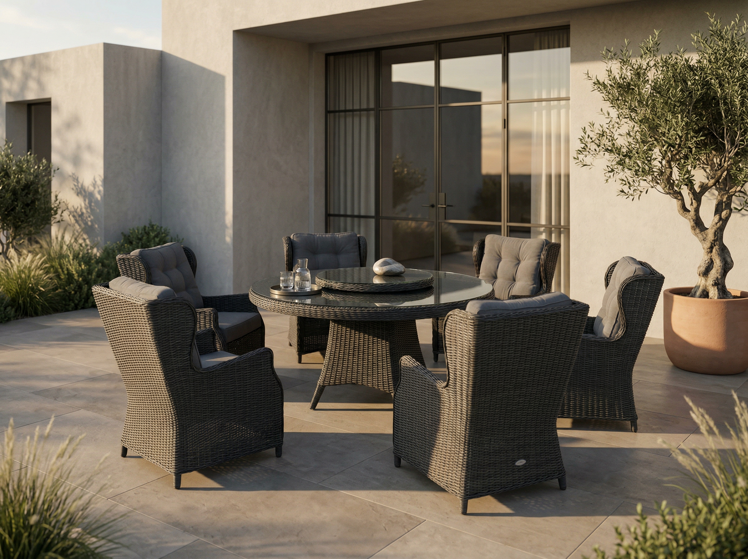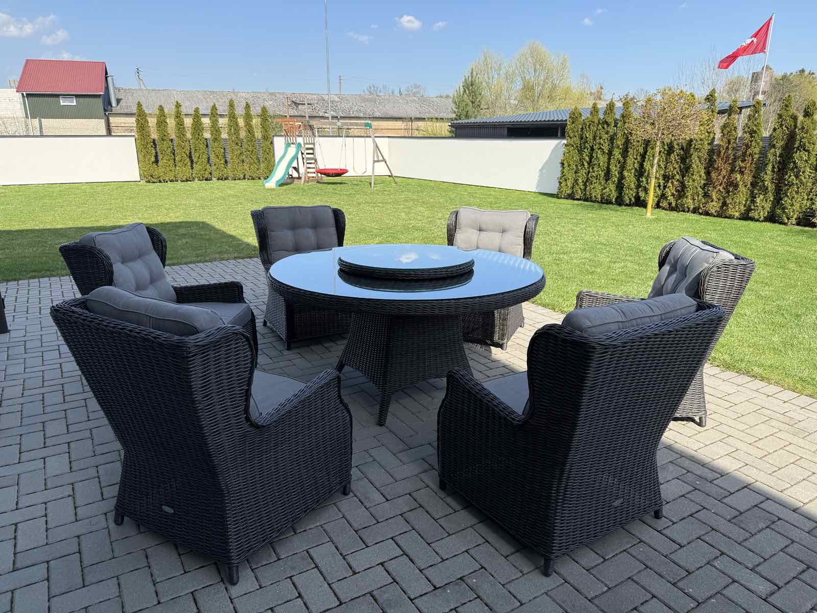Šis valgomojo komplektas yra puikus pasirinkimas tiek mažoms, tiek didelėms terasoms. Jo universalumas leidžia pritaikyti baldus pagal jūsų poreikius ir sukurti jaukią, patogią ir stilingą lauko erdvę.