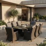 Šis valgomojo komplektas yra puikus pasirinkimas tiek mažoms, tiek didelėms terasoms. Jo universalumas leidžia pritaikyti baldus pagal jūsų poreikius ir sukurti jaukią, patogią ir stilingą lauko erdvę.