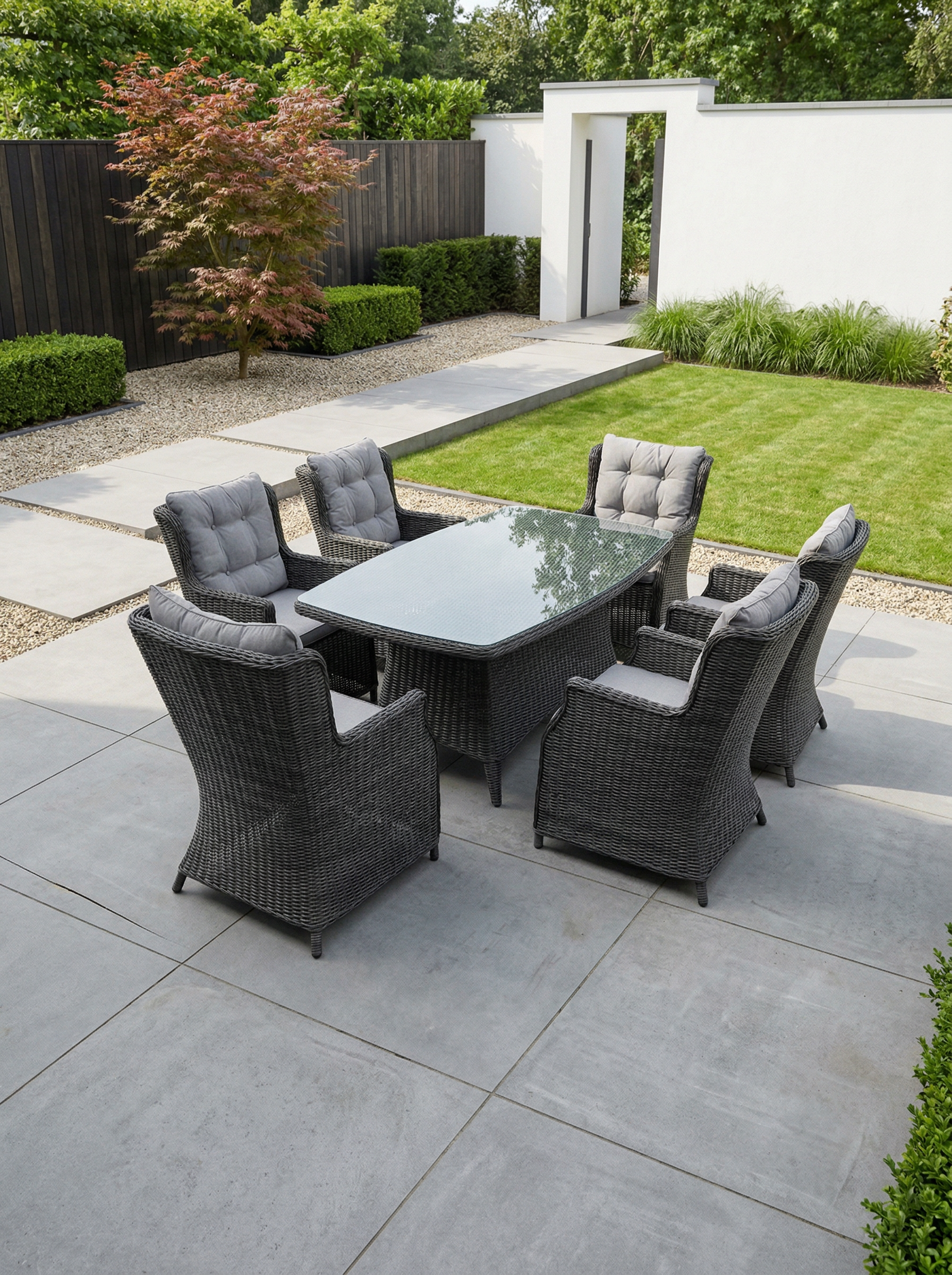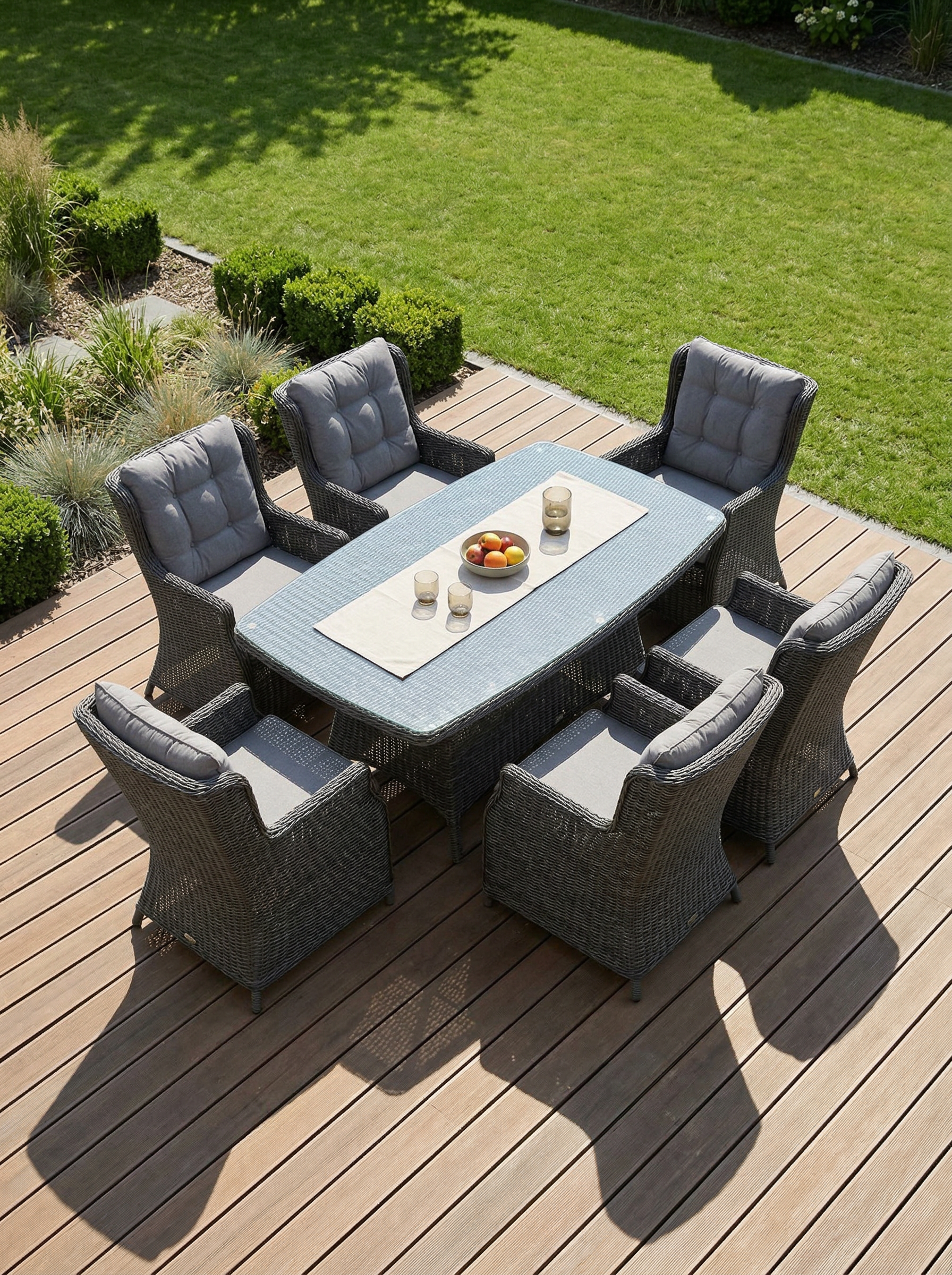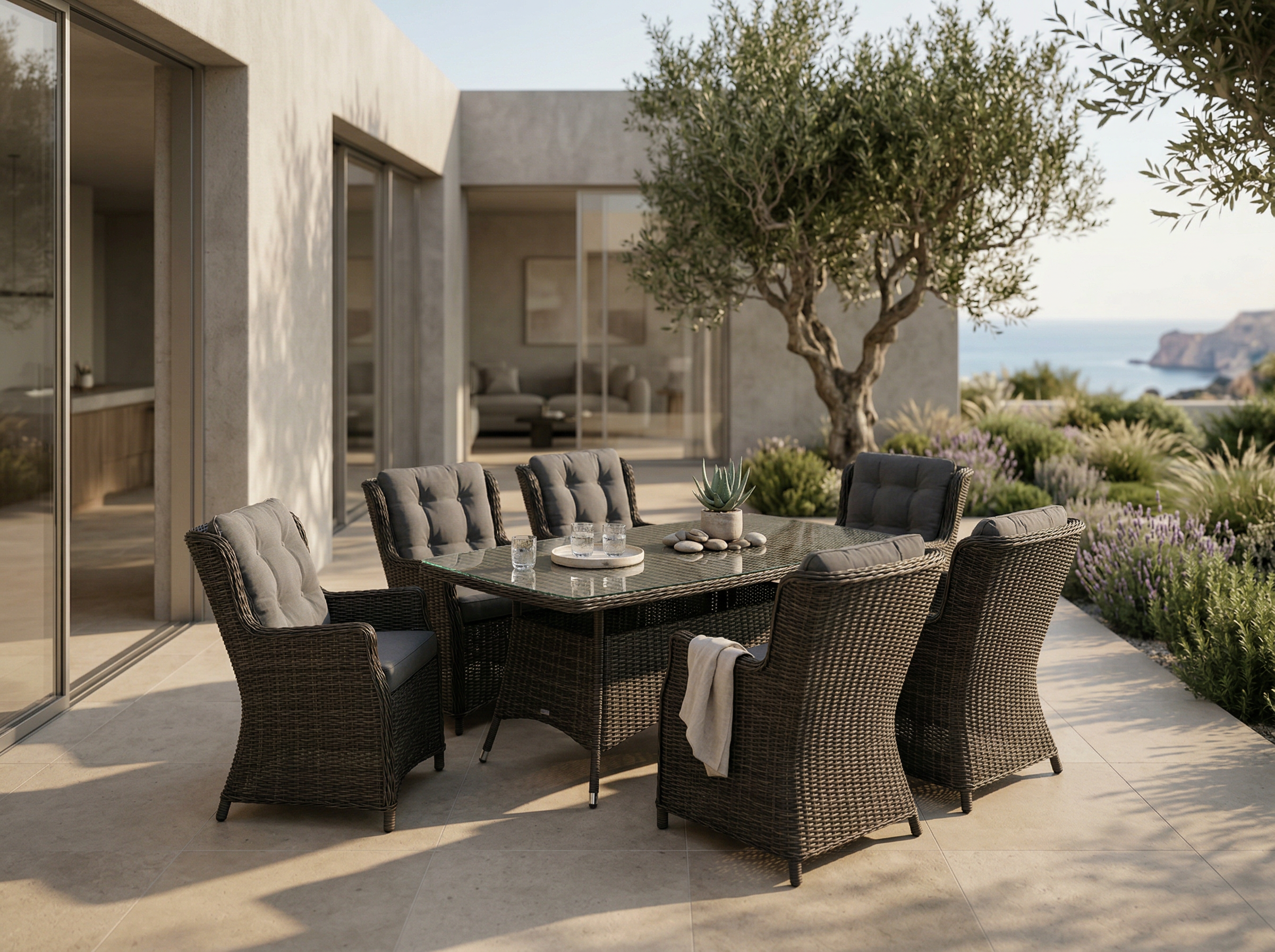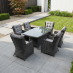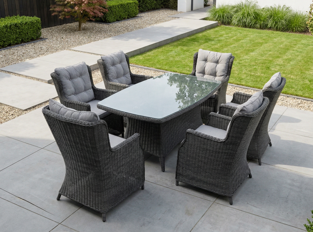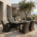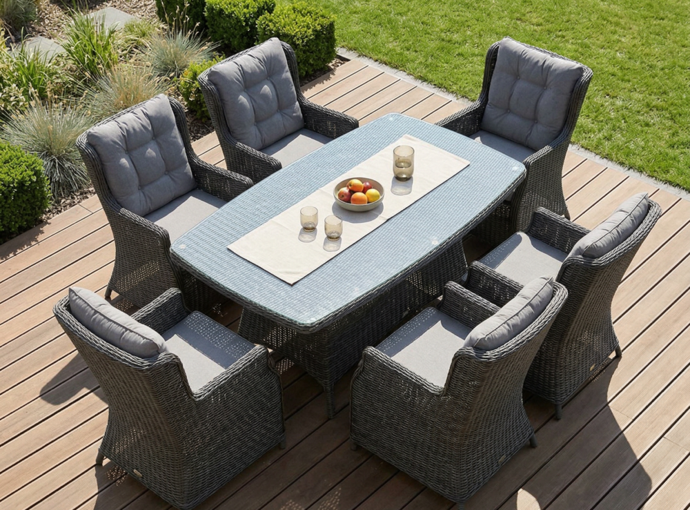 Šis valgomojo komplektas yra puikus pasirinkimas tiek mažoms, tiek didelėms terasoms. Jo universalumas leidžia pritaikyti baldus pagal jūsų poreikius ir sukurti jaukią, patogią ir stilingą lauko erdvę.